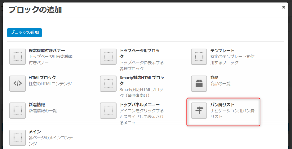 | テンプレート | ブロックの表示に使用されるテンプレートです。(「パン屑リスト」固定) |