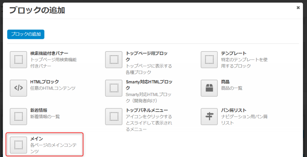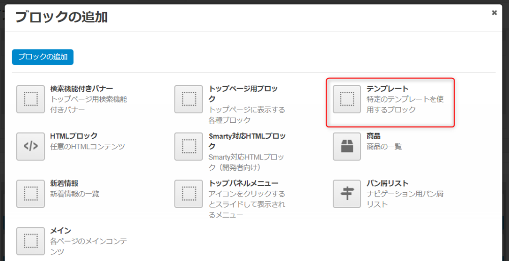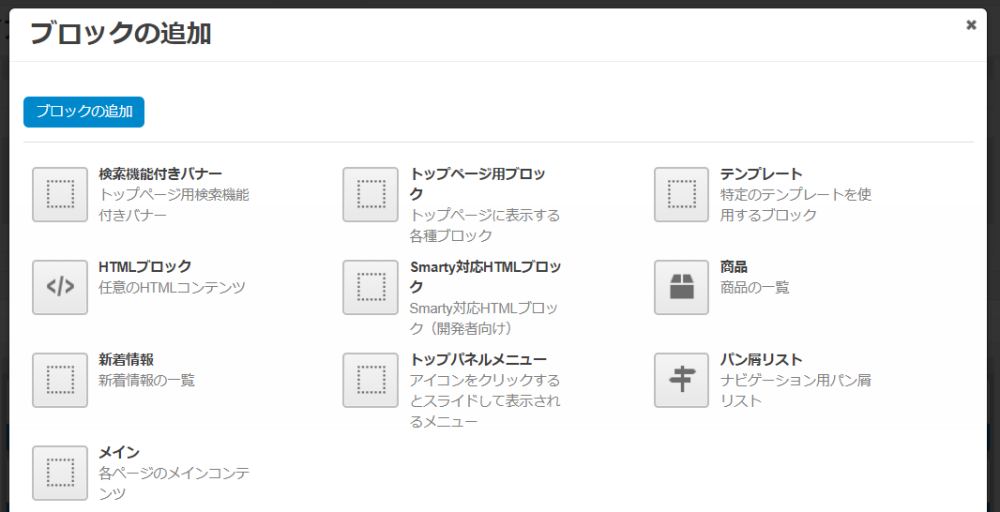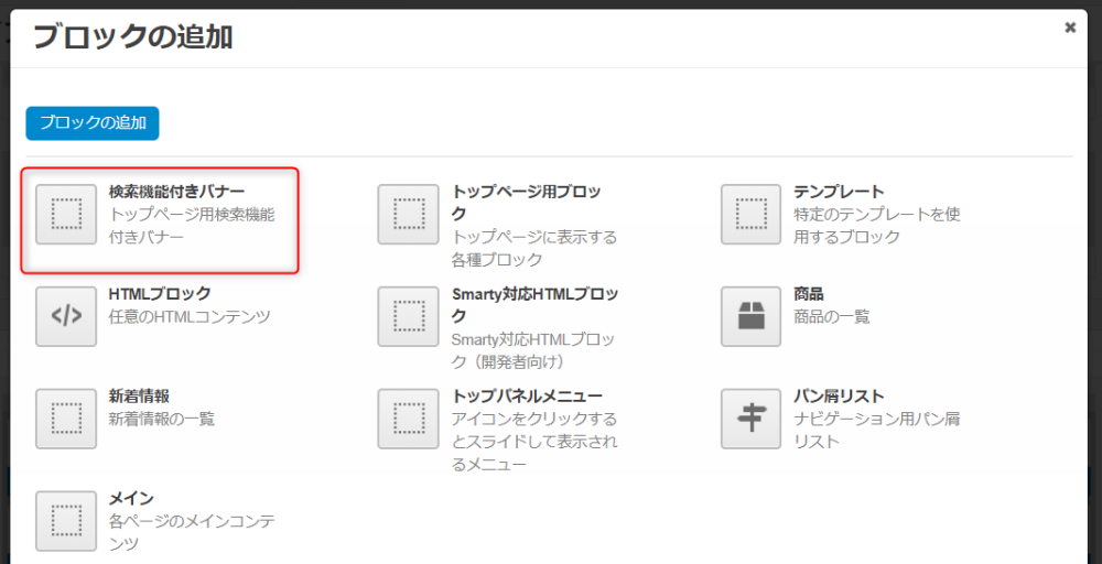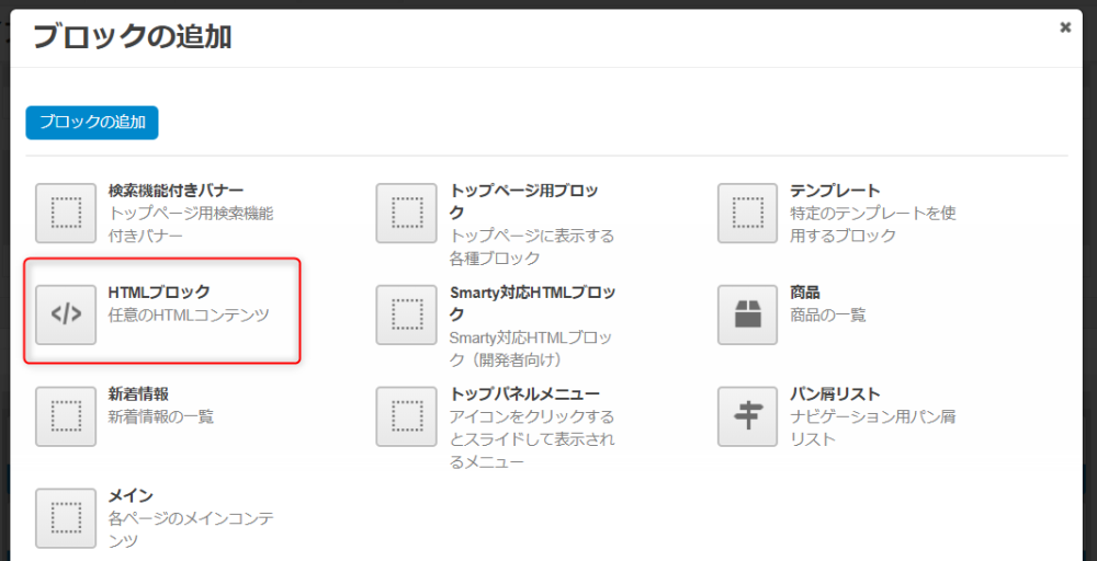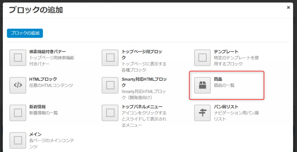 | 「商品の追加」ボタン | クリックするとブロックに表示する商品を指定できます。 |