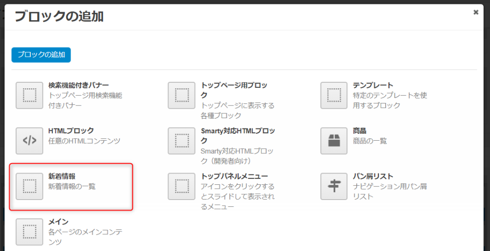 | テンプレート | ブロックの表示に使用されるテンプレートです。(「新着情報」固定) |