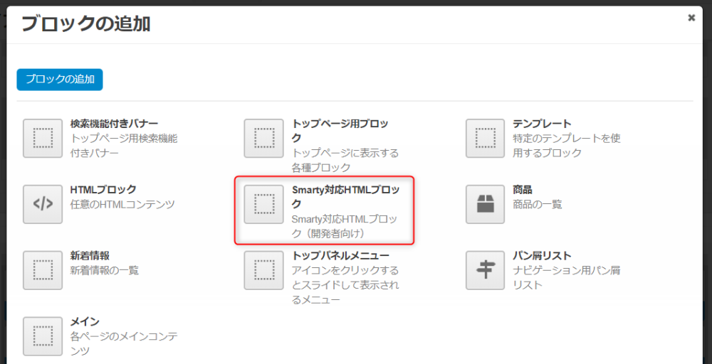| テンプレート | ブロックの表示に使用されるテンプレートです。(「Smarty対応HTMLブロック」固定) |