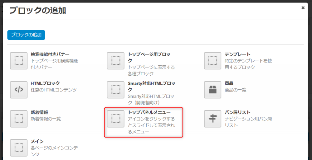 | テンプレート | ブロックの表示に使用されるテンプレートです。(「トップパネルメニュー」固定) |