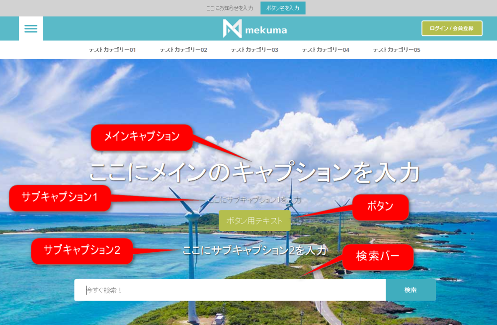 | メニューバーに表示するコンテンツ | メニューバーのコンテンツを以下から指定できます。 - なし - カテゴリー - メインメニュー 「メニューの管理」リンクをクリックするとメニュー管理ページ に遷移します。 |