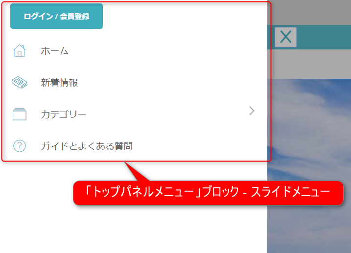 アイコンをクリックするとスライドして表示されるメニューやメニューバーを表示するブロックです。