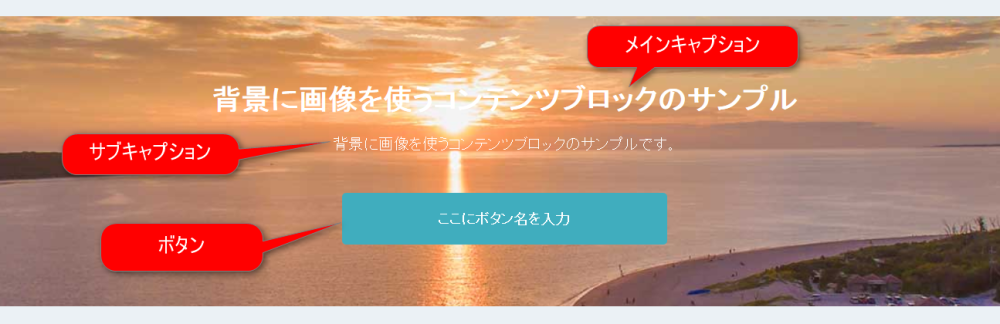 背景画像やキャプション、ボタンなどで構成されるオリジナルコンテンツを表示するブロックです。