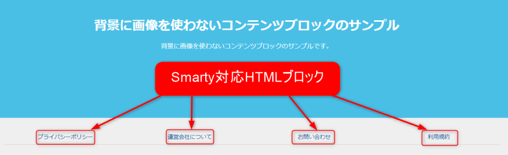 ウェブサイトの運営者が登録した任意のHTMLコンテンツを表示するブロックです。(Smarty対応)