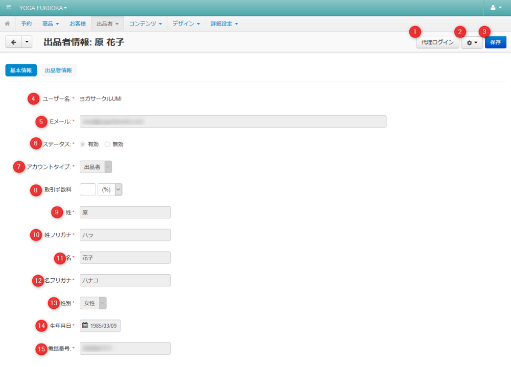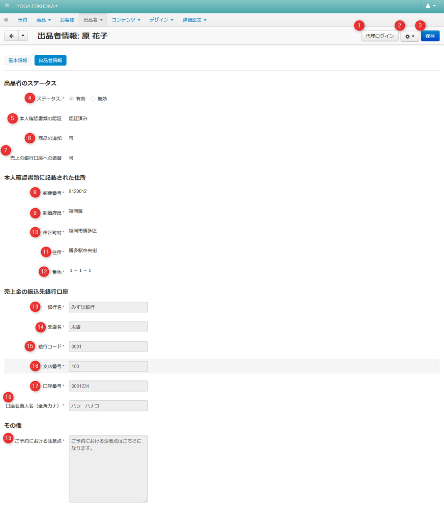 | 06 | 出品者のステータス | 出品者としての現在のステータスです。クリックすると他のステータス(有効 / 無効 )に変更できます。 |
