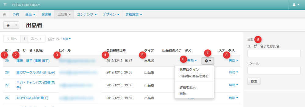 このページで出品者情報の確認・ステータス変更・削除を行うことができます。