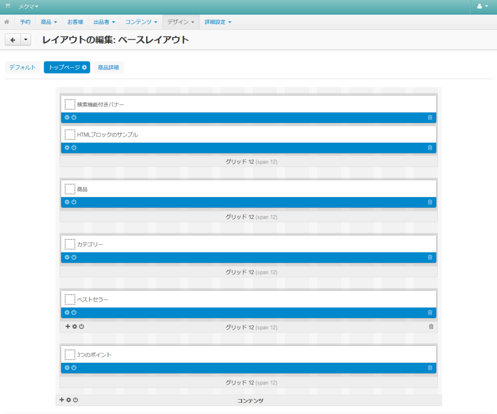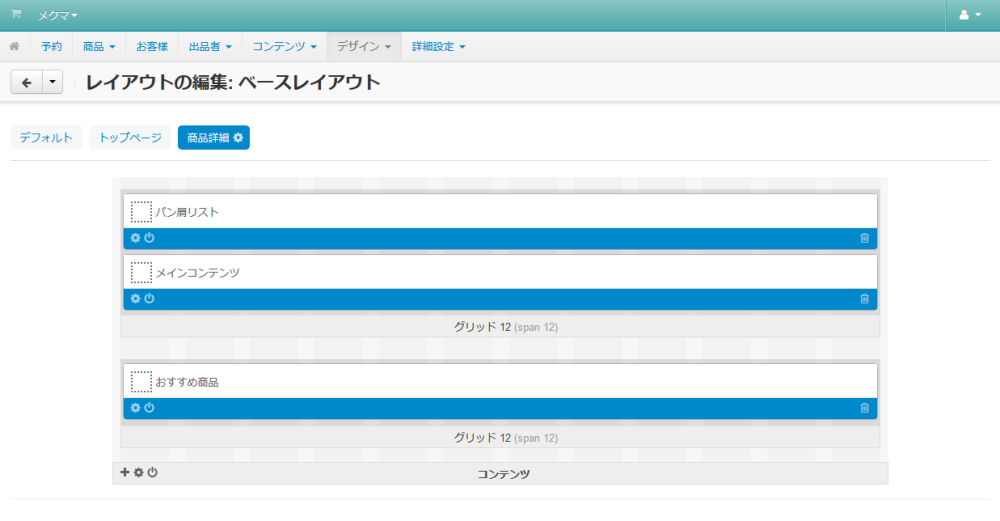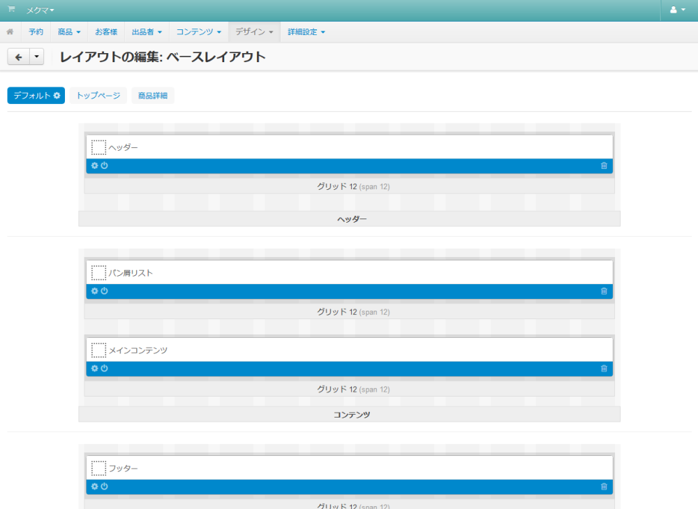 各ページに共通して表示されるレイアウトを定義する「 デフォルト 」タブと、トップページのレイアウトを定義する「 トップページ 」 タブ、そして各商品の詳細ページのレイアウトを定義する「 商品詳細 」 タブで構成されています。