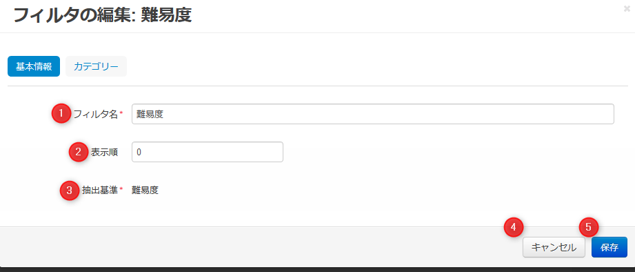 | 04 | 「キャンセル」ボタン | 属性情報の新規登録または編集をキャンセルしてフィルタ一覧に移動します。 |