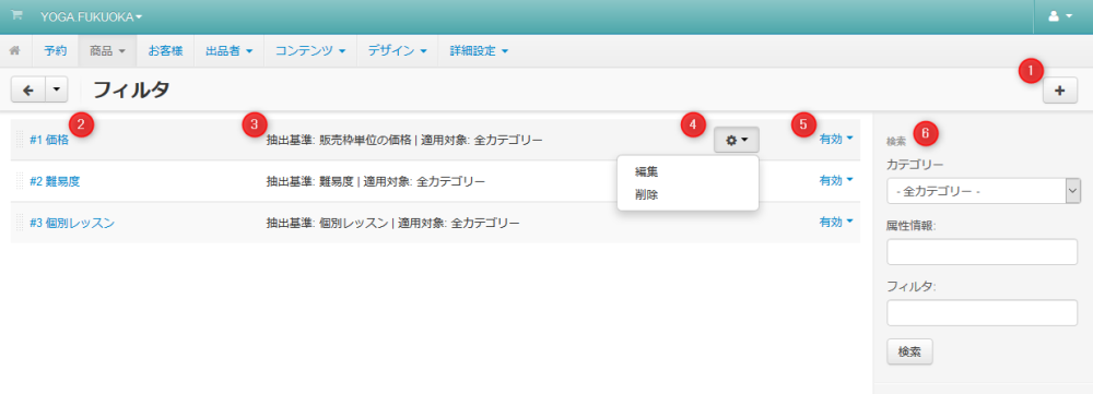 | 04 | 歯車アイコン | フィルタにカーソルを合わせると表示されます。 クリックすると「編集」「削除」リンクが表示されます。 |