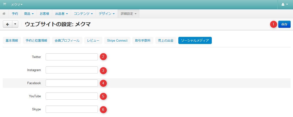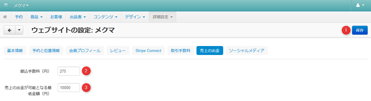 サービス名や取引手数料など、mekumaで構築・運用するウェブサイトに関する各種設定を行うページです。