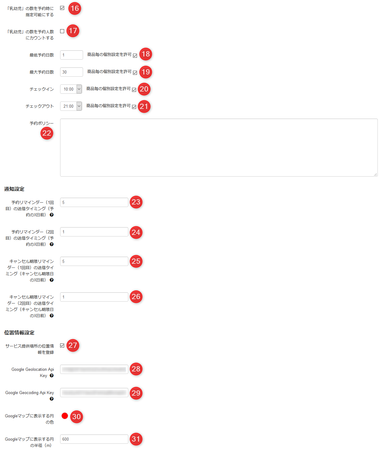 提供するサービスや場所の所在地をGoogleマップで表示する場合は、Googleの Geocoding API および Geolocation API のAPIキーをお客様にて取得し、mekumaの管理画面から登録する必要があります。