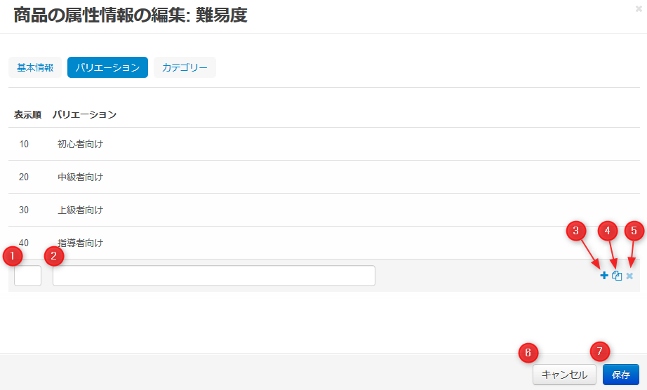 | 04 | 「コピー」アイコン | バリエーションの内容を新しいバリエーションの入力欄にコピーします。 ※ 入力欄にカーソルを合わせると表示されます。 |