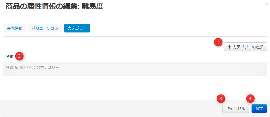 | 01 | 「カテゴリーの追加」ボタン | クリックすると属性情報を設定可能にするカテゴリーを追加できます。 |