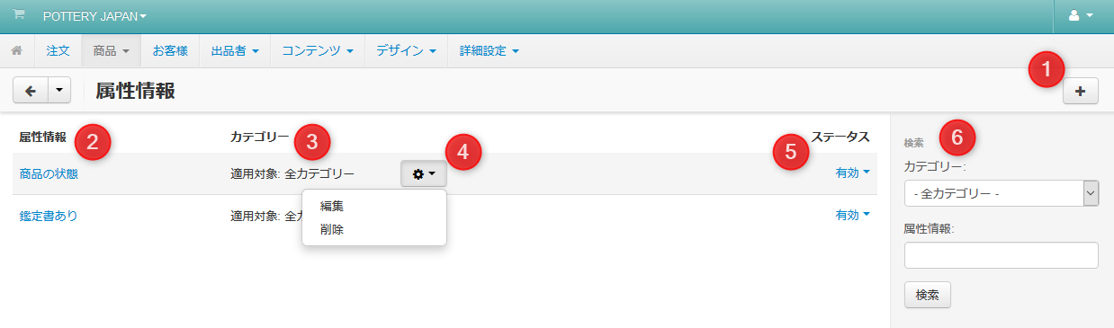| 04 | 歯車アイコン | 属性情報にカーソルを合わせると表示されます。 クリックすると「編集」「削除」リンクが表示されます。 |