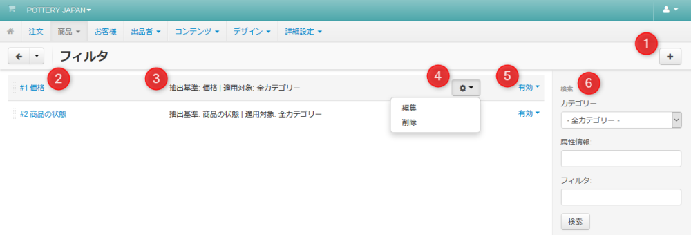 | 04 | 歯車アイコン | フィルタにカーソルを合わせると表示されます。 クリックすると「編集」「削除」リンクが表示されます。 |