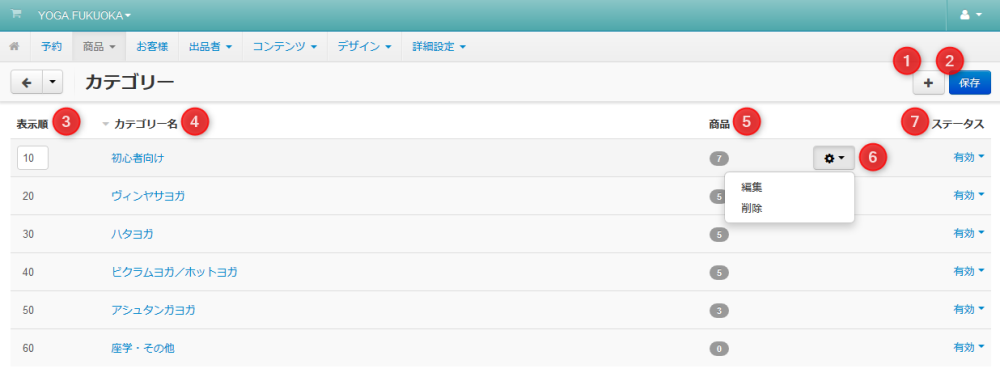| 05 | 商品 | 当該カテゴリーに登録した商品数です。クリックすると商品の一覧が表示されます。 |