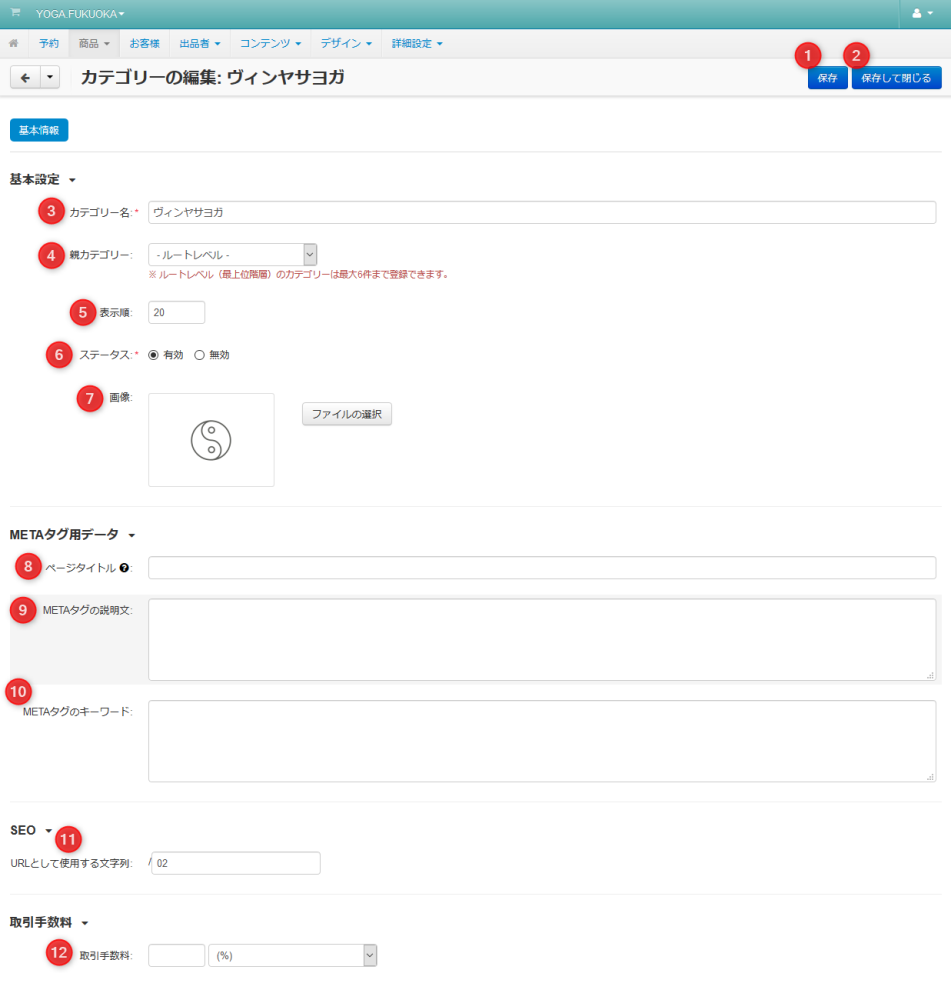 | 12 | 取引手数料 | カテゴリー内の商品に適用される取引手数料(%)を入力します。 |
