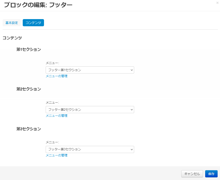 | 第3セクション | フッターの第3セクションに表示するメニューを指定します。 ※ メニューの内容は コンテンツ → メニュー にて設定できます。 |