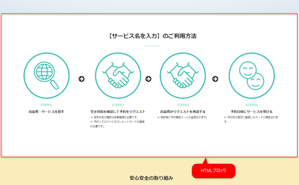 ウェブサイトの運営者が登録した任意のHTMLコンテンツを表示するブロックです。