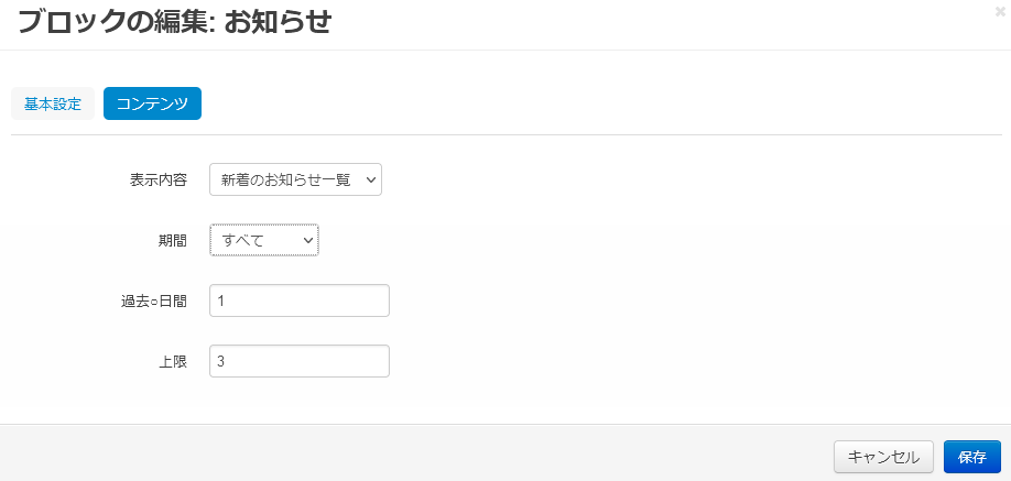 | 上限 | ブロックに表示するお知らせの上限数を指定します。 |