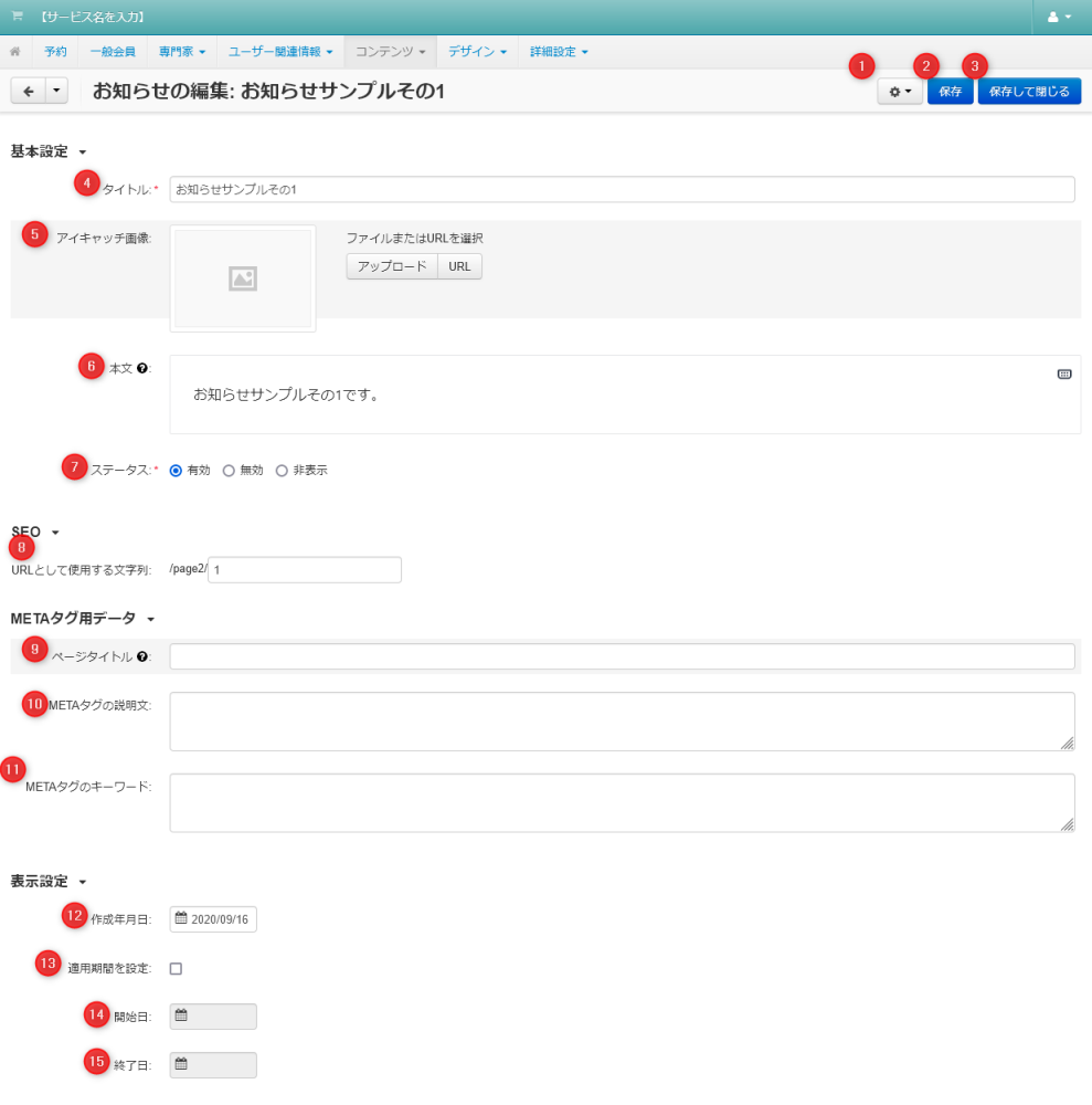 | 04 | タイトル | お知らせのタイトルを入力します。 |