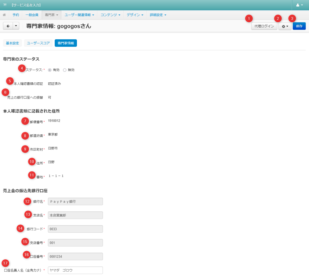 | 04 | ステータス | 専門家としてのステータス(有効 / 無効)が表示されます。 |
