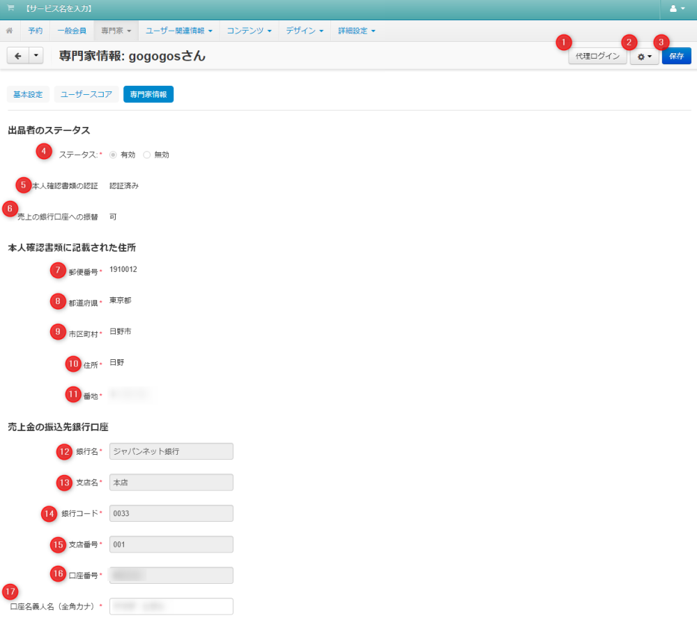 | 07 | アカウントタイプ | 会員アカウントのタイプが表示されます。(「専門家」固定) |