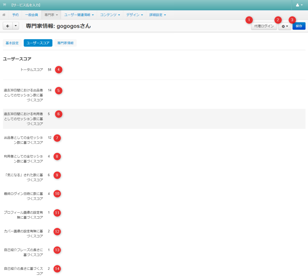 | 07 | 専門家としての全セッション数に基づくスコア | 5 : 50件以上 4 : 20件以上 3 : 5件以上 2 : 1件以上 1 : 0件 に、6を乗じた数値が付与されます。 |