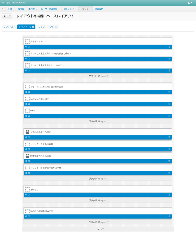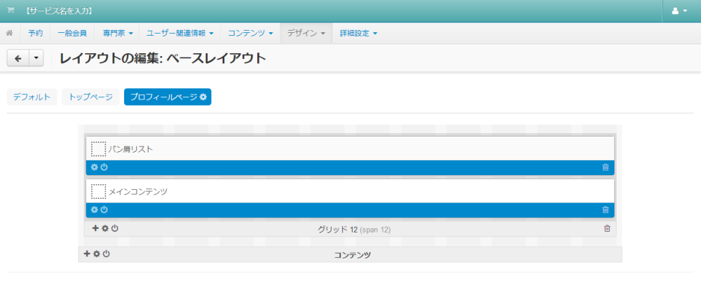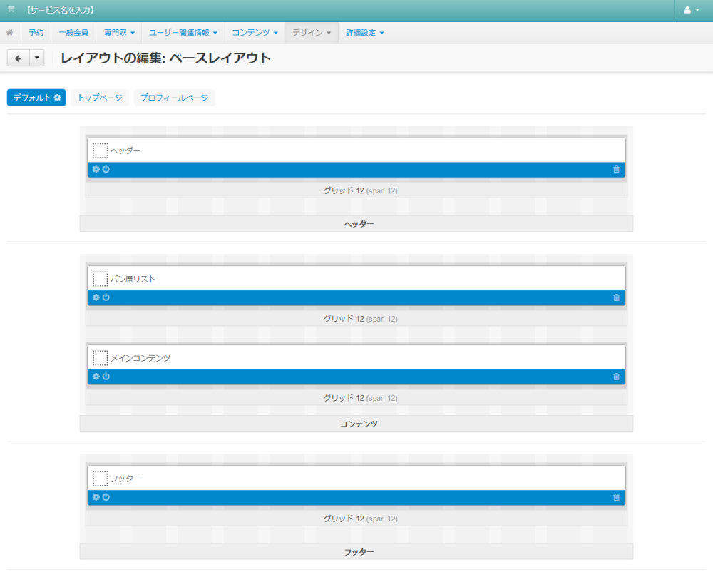 各ページに共通して表示されるレイアウトを定義する「 デフォルト 」タブと、トップページのレイアウトを定義する「 トップページ 」 タブ、そして各専門家のプロフィールページのレイアウトを定義する「 プロフィールページ 」 タブで構成されています。