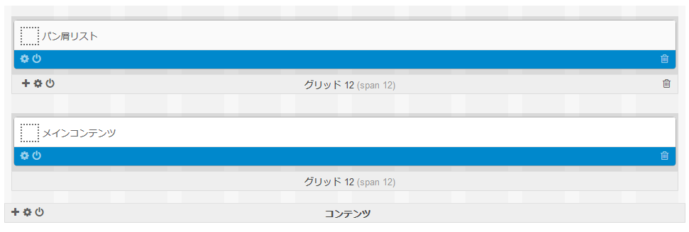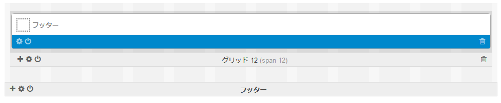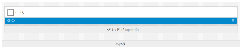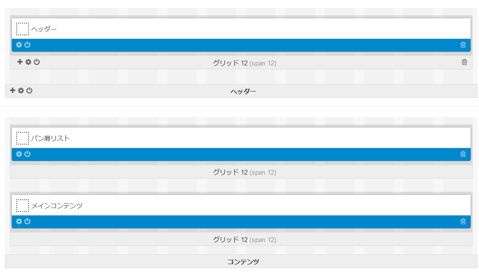「デフォルト」タブでは「 ヘッダー 」「 コンテンツ 」「 フッター 」の3つの基本グリッドが表示され、これらの基本グリッドの中に子グリッドおよびブロックを配置していきます。