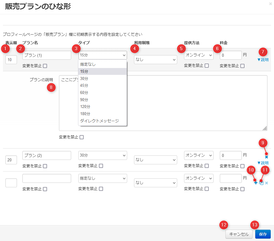 | 12 | 「キャンセル」ボタン | 変更内容を保存せずに販売プランのひな形にアクセスするためのページに戻ります。 |