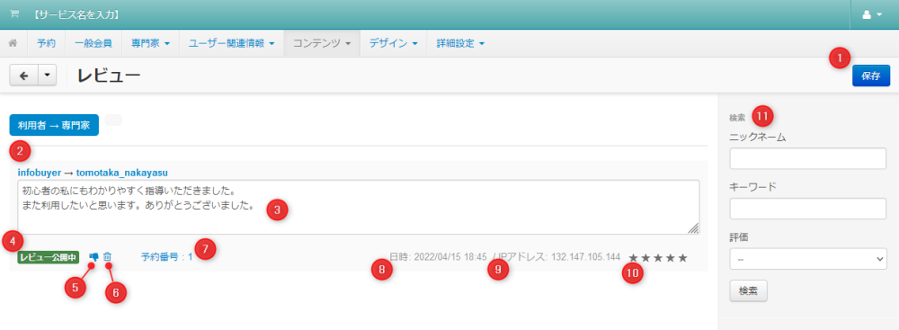 | 02 | 利用者と専門家のユーザー名 | レビューを投稿した利用者と、レビューを受けた専門家のユーザー名が表示されます。 |