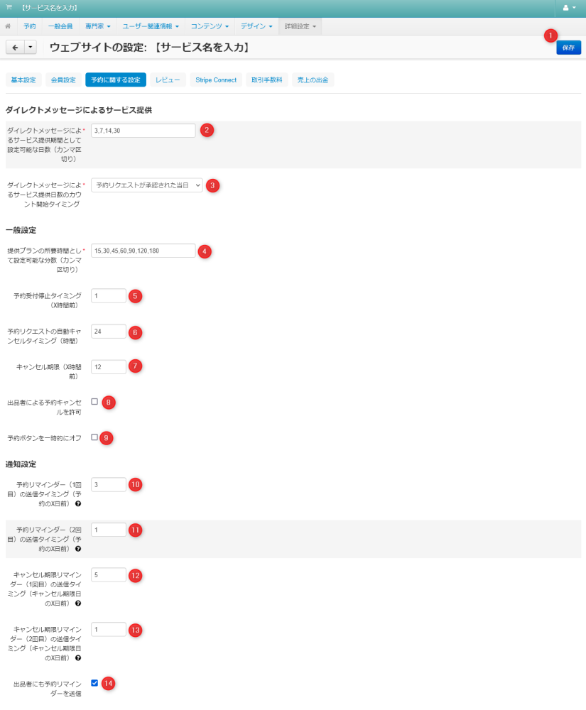 | 14 | 専門家にも予約リマインダーを送信 | 利用者だけでなく専門家にも予約リマインダーを送信する場合にチェックします。 |