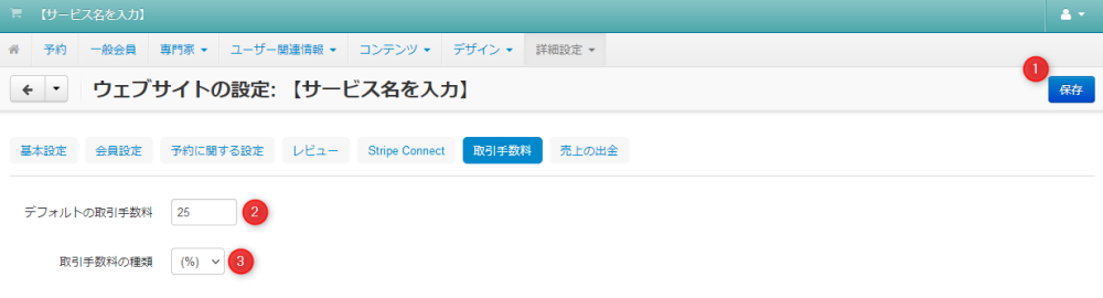 | 02 | デフォルトの取引手数料 | 運営者が専門家から取引額に応じて徴収する取引手数料の料率(%)を入力します。 |