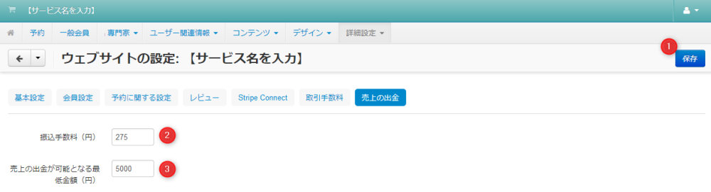 | 03 | 売上の出金が可能となる最低金額(円) | 専門家による売上の出金が可能となる最低金額(円)を入力します。 |
