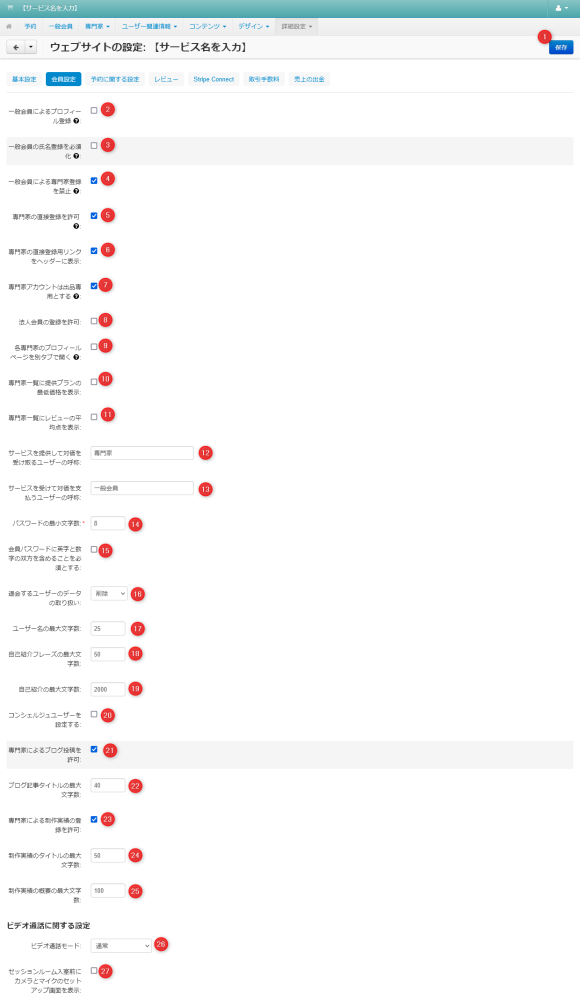 | 07 | 専門家アカウントは出品専用とする | チェックすると専門家には一般会員向けメニューは表示されず、他の専門家のプランの予約もできなくなります。 |