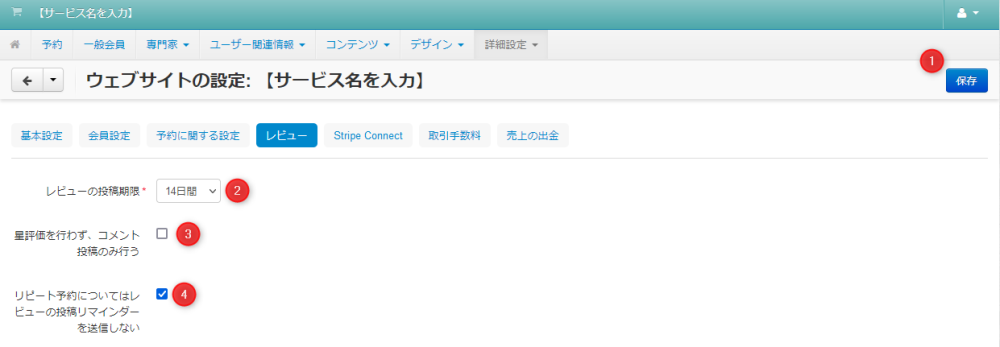 | 02 | レビューの投稿期限 | レビューの投稿期限(利用開始日時からX日間)を選択します。 |