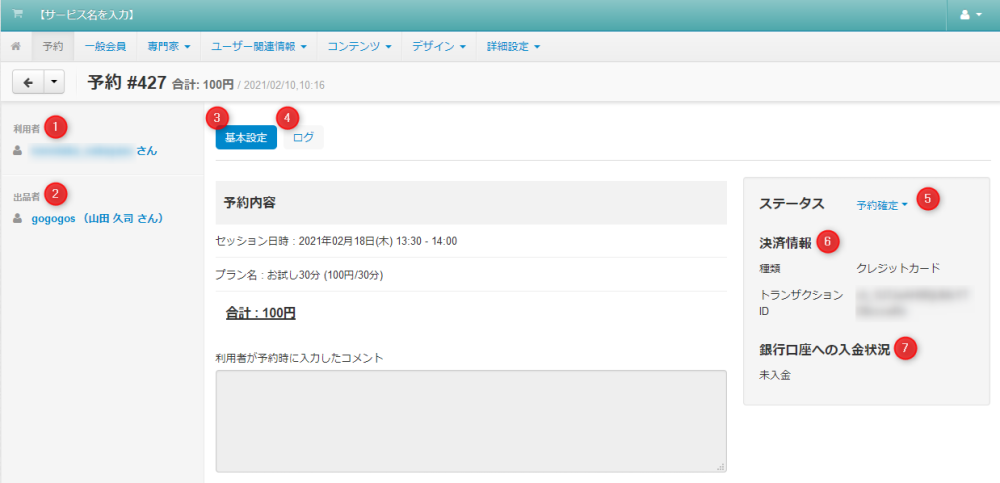 | 07 | 銀行口座への入金状況 | この予約の売上について、専門家の銀行口座への入金状況が表示されます。 |