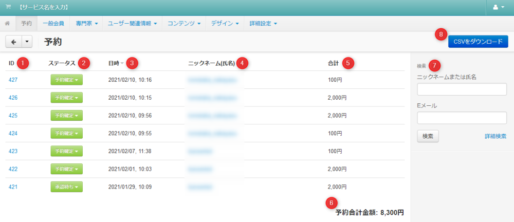 | 08 | ダウンロードボタン | 予約情報をCSV形式でダウンロードできます。 |